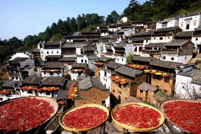 挂在山崖上的篁岭古村,“地无三尺平”,数百栋徽派民居在百米落差的坡面错落排布,每当日出山头,晨曦日照,整个山间房屋晒架上五彩缤纷的丰收果实,绘就出少见的“晒秋”农俗景观。春晒茶叶、夏晒山蕨、秋晒果蔬、冬晒乡俗……一年四季延绵有续。