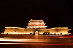 广济门城楼是一座宫殿式三层歇山顶阁楼,外城门原有“东为万春”门额。楼置于高大厚实的台基上,拱门中开,面阔七间,进深五间,前后面为木石柱相衔接支撑,并跨出城墙外,成为骑楼。