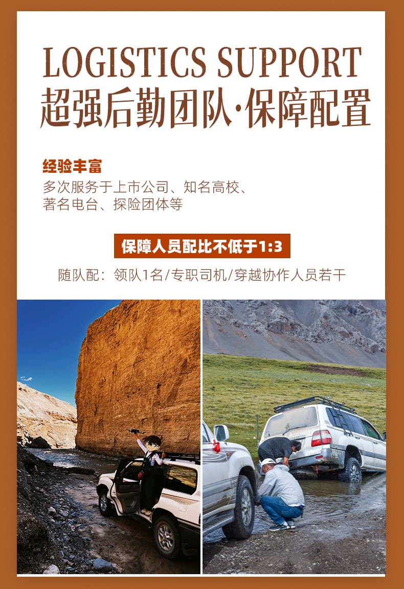 1、交通:全程乘坐丰田坦途/普拉多/陆巡等同级别越野车(3位队员一车),给养保障车为四驱越野车、越野皮卡,自驾车辆的备油保障车负责运输;