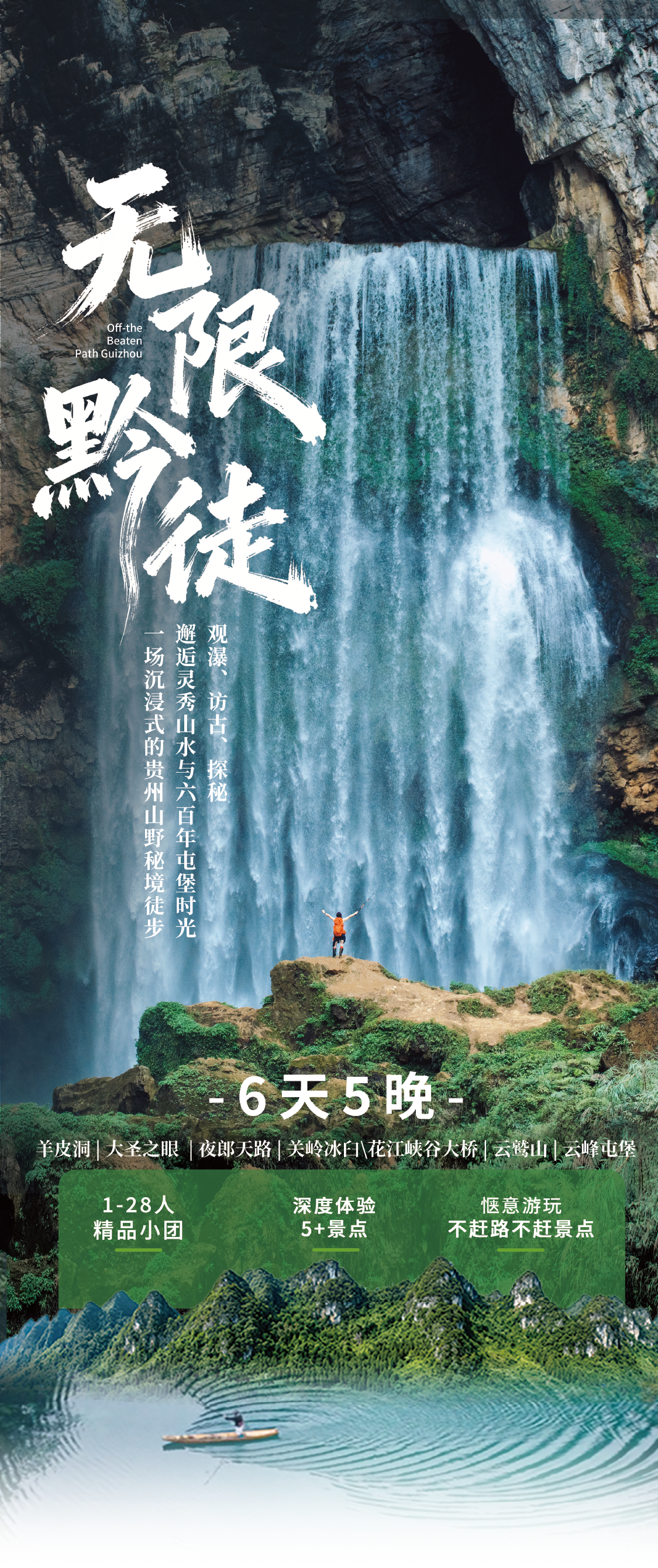 早餐后乘车前往徒步起点。热身后,我们将沿着湿滑陡峭的原始小径下探峡谷,当轰鸣水声渐近,磅礴的羊皮洞瀑布豁然眼前。您可在水雾弥漫中尽情创作大片。中午在开阔处分享自带路餐。下午可随领队探索瀑布旁的洞穴,随后徒步环线返回,乘车回贵阳。