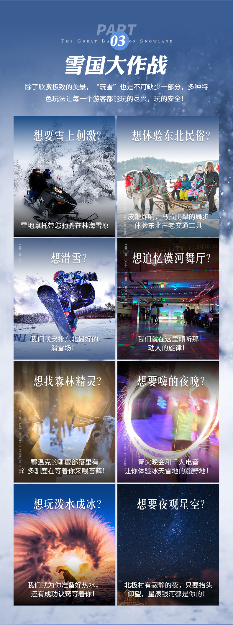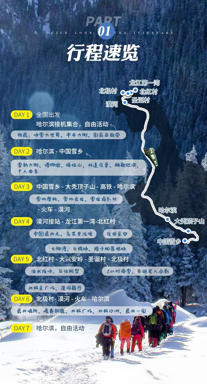 【雪韵大街】【棒槌山】【栈道夜景】【秧歌巡演】【千人电音】【雪地摩托】【雪地长龙】【女脚湾】【白桦林】【樟子松原始林】【各种找北】【漠河舞厅】