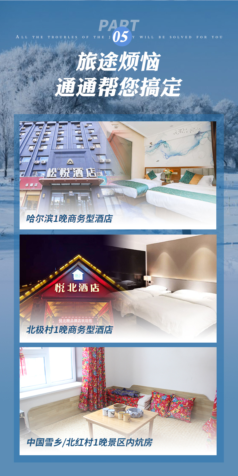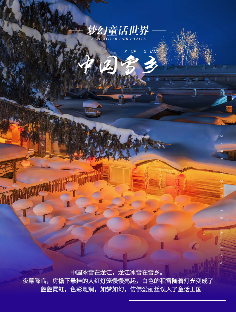 【门 票】:中国雪乡门票+环保车票、龙江主峰套票、马拉爬犁体验票、龙江第一湾+环保车门票、北极村门票、驯鹿园票、圣诞村门票、圣诞村滑雪2小时(雪板+雪鞋+雪杖)、漠河舞厅门票;