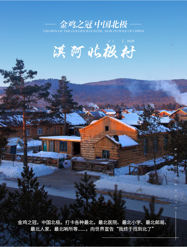 √ 车程11:30-12:00,祖国最北端,有着金鸡之冠、神州北极之称的【北极村旅游风景区】,这里是漠河市的北极镇所在地,人口2806人,面积16平方公里。地理坐标在北纬53’33’,中国纬度最高处。黑龙江从北面蜿蜒流过,对岸便是俄罗斯阿穆尔州。