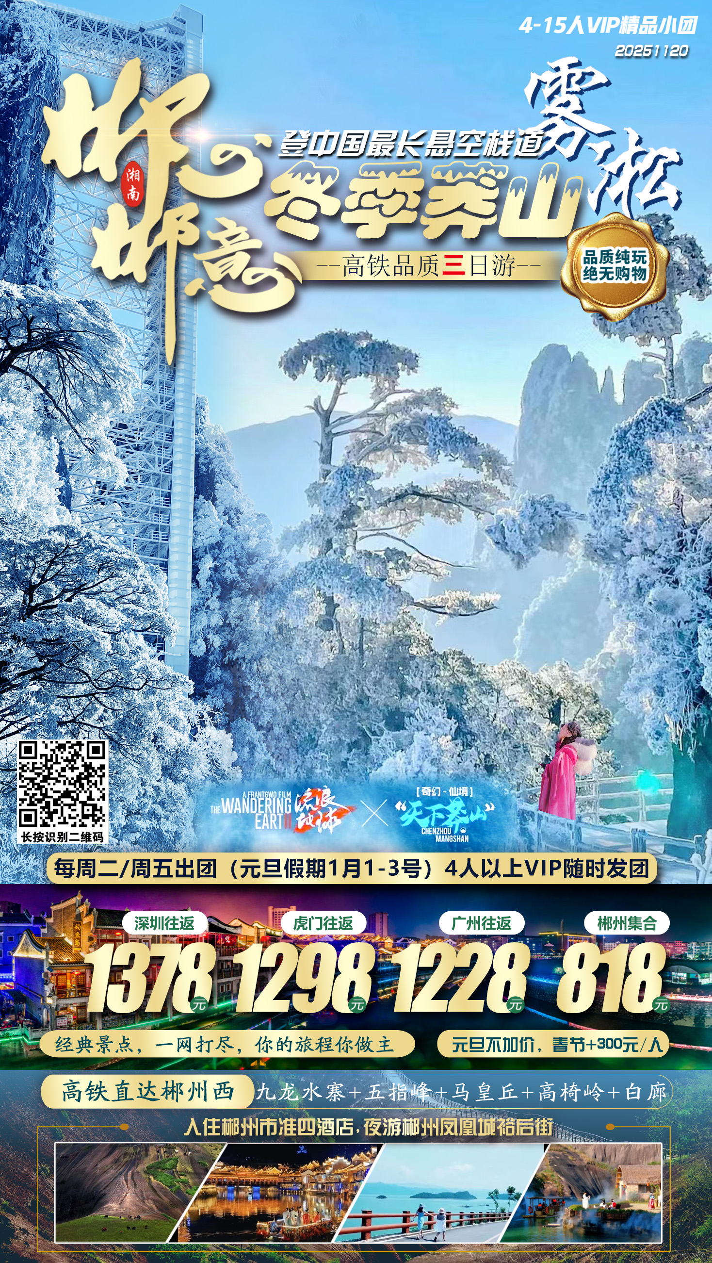 10:00自由到达景区东门口,坐景区接驳车,然后换乘缆车上山(没有其他交通工具,缆车费用自理);南中国最长悬空栈道:乘坐中国目前最长索道单线的观光缆车【五指峰索道】索道全长3.7公里,全国单线最长;每小时客运量达2000人,全国功率最大;全球索道极限高差,达1000米,创造了全国乃至全球索道领域的多项第一,堪称“世界一流、中国第一”五指峰索道。