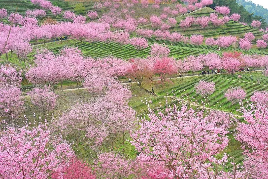 万株樱花在千亩茶田间恣意绽放