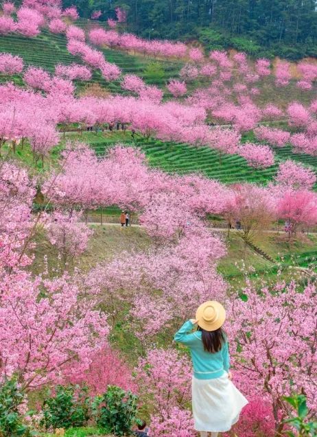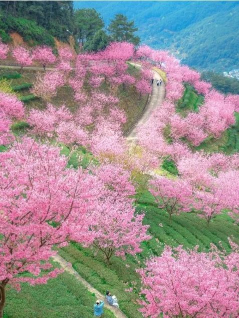 满山遍野的樱花盛开,像是闯进了漫画世界