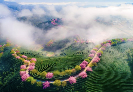 漫步其中,茶绿樱红、云雾缭绕,视觉效果超级震撼,