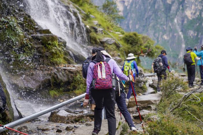 吃过早餐后前往尼农村,途经澜沧江峡谷约1小时抵达尼农,随后开始徒步向雨崩村前进。今天全程大约14公里。用时6-7小时。沿着尼农大峡谷一路徒步,两边是悬崖峭壁,这是古人从悬崖上凿出来的一条通往雨萌秘境的阳光大道。徒步大约3.5小时到达补给点在这里稍作休息,后沿着公路前往雨崩,沿途美景如画,令人目不暇接。