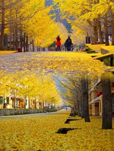 黄金大道,街道边种了两排银杏树,和白色的路灯相配,宛若欧洲小镇,风情万种,金秋的帽子峰,呈现给游客一个五彩斑斓的世界。