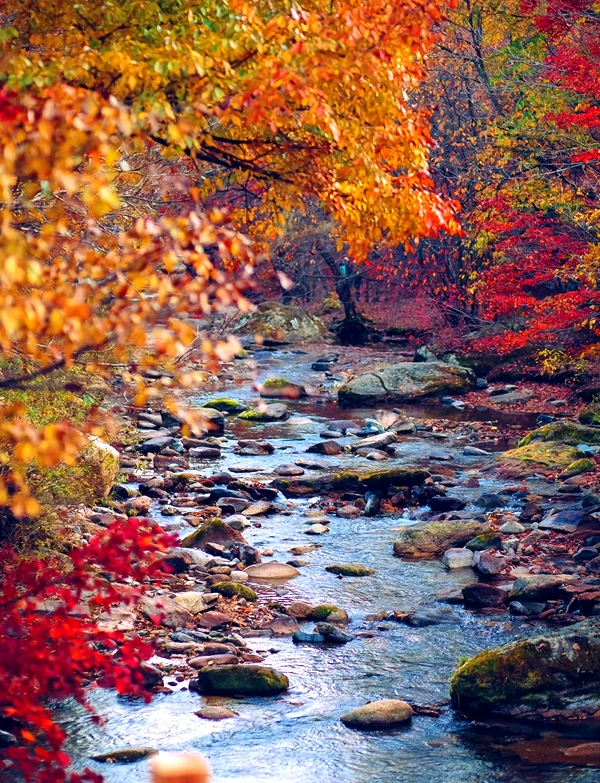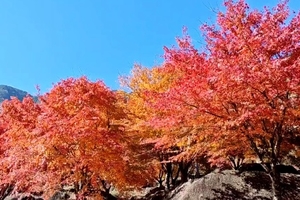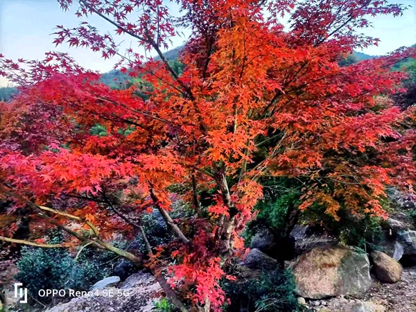 12:30 到达【十里枫叶林】,走路20分钟抵达枫叶林。抬眼望去,层层叠叠的枫叶红得浓烈,红得似火,染红了山谷,染红了山涧,就像一条鲜红的地毯铺在蜿蜒曲折的山谷中,美轮美奂,美不胜收。