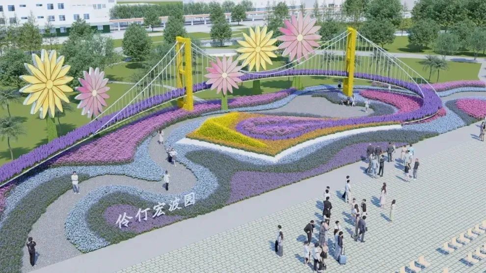 亮点二 1400平方米深中通道主题大型造景,通过模拟深中通道的深中大桥和西人工岛,配合蓝紫色花境模拟的海水波涛以及绚丽夺目烟花灯饰,赞颂这一意义非凡的世界级跨海集群工程。