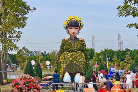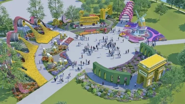 亮点三 荷兰风车花园用菊艺扎作出风车、木鞋、花田;法国画廊花园用菊花搭建地标性建筑物凯旋门;德国啤酒花园以黄菊动态呈现流动的啤酒;英国巴士花园模拟打造双层复古巴士、电话亭、伦敦桥场景。