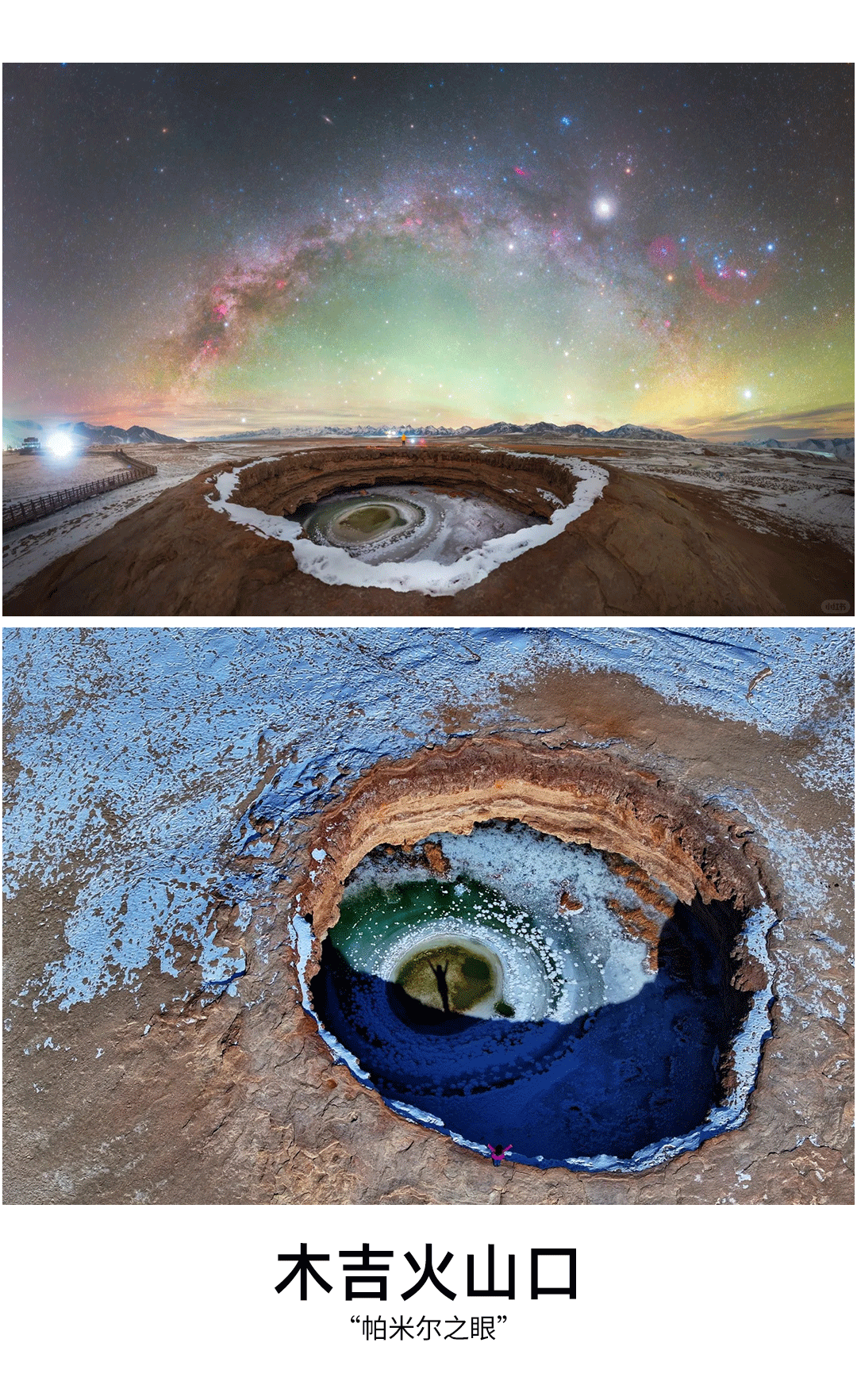 第一站前往木吉火山口。在新疆最西部阿克陶县木吉乡的帕米尔高原上,有一座似梦幻一般的山谷。它就是有“帕米尔之眼”之称的木吉火山,全名喀日铁米尔火山群。柯尔克孜语,意为“喷发”。1500年前的火山喷发留下冰与火的幻境,与十八罗汉雪峰摇摇相守。虽然它是很久以前喷发的,但目前仍保留着透明的冰川、清澈的冰蚀湖、深不见底的冰洞、甘甜的冰川雪水。在整个卡日铁米尔境内,拥有着大大小小13处火山口,他们之间相互交错,高低错落,形状各异,以它们独特的造型和不同的地质色彩,向人们讲述着一千年前这里发生的故事。