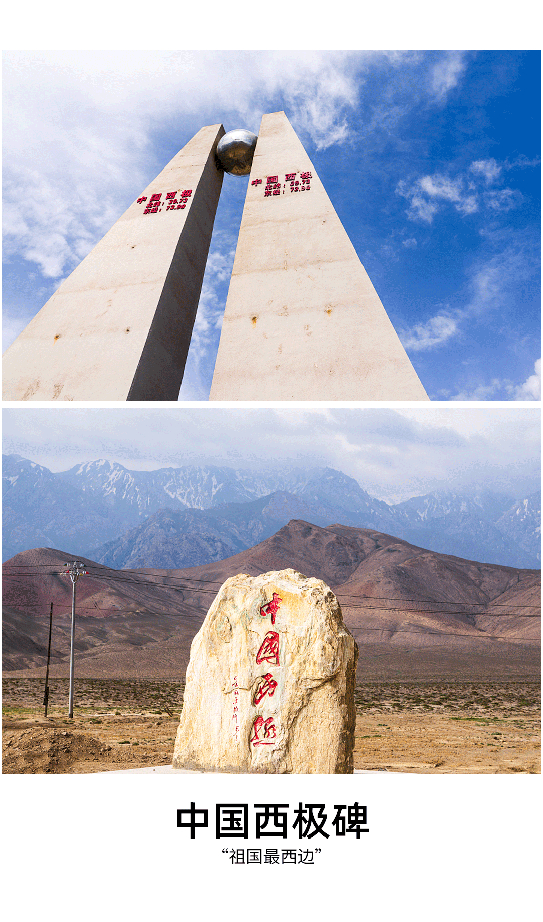 今日早餐后前往本次最后一站,【中国西极】。这里是中国领土最西的地方,这里有个77号界碑,是国人能够到达的最靠中国西极的界碑。从喀什出发翻越海拔2971米的阿克托达坂后,过加斯木桥即是天山和昆仑山的交界处。在缓冲带停好车,眼前即是喀什噶尔河的支流克孜勒苏河,左边黑色的是昆仑山,右边红色的是天山。继续前往在乌鲁克恰提乡附近可以观赏开阔的河谷和牧场,以及遍布周边类似丹霞彩丘的红层地貌,如果碰到下雨天,河水也会变成红色。当车来到一座写着“西极疆门”红色的牌坊下,停好车就可以沿着木栈道拾级而上到海拔3100米标识着经纬度的中国西极石碑处。