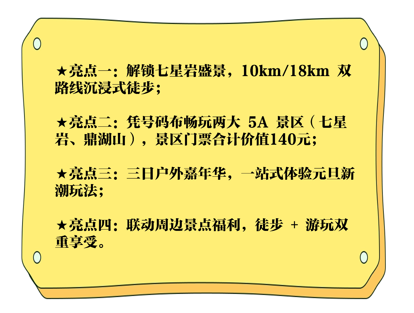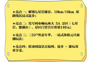 10:00-17:00 徒步大会进行时,沿着路线指引前进,开启徒步挑战!体验组关门时间5小时,挑战组关门时间7小时(路线均进入七星岩景区,打卡景区核心景点);