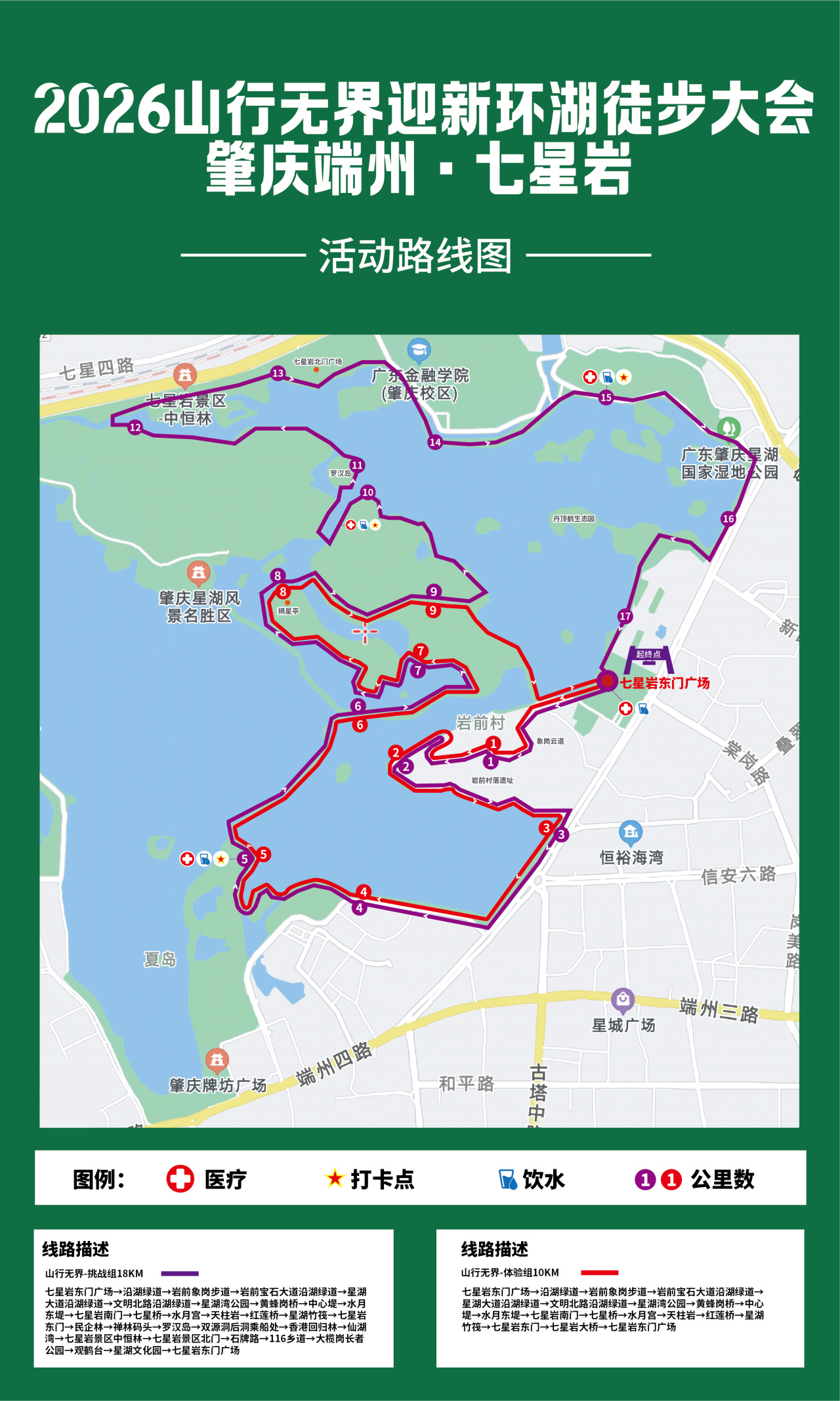 在 10KM 路线的精华基础上,18KM 挑战组带你走进更多秘境。从七星岩东门广场出发,走完核心环湖路段后,将深入七星岩景区腹地:禅林码头的静谧、罗汉岛的清幽、双源洞后洞的奇趣,让徒步不止于 “走”,更在于 “探”。