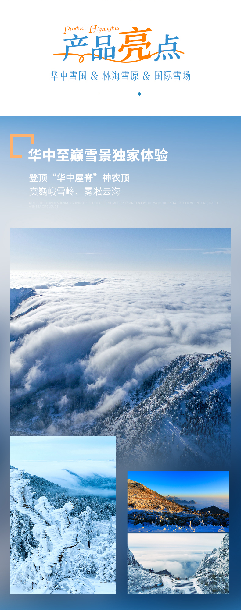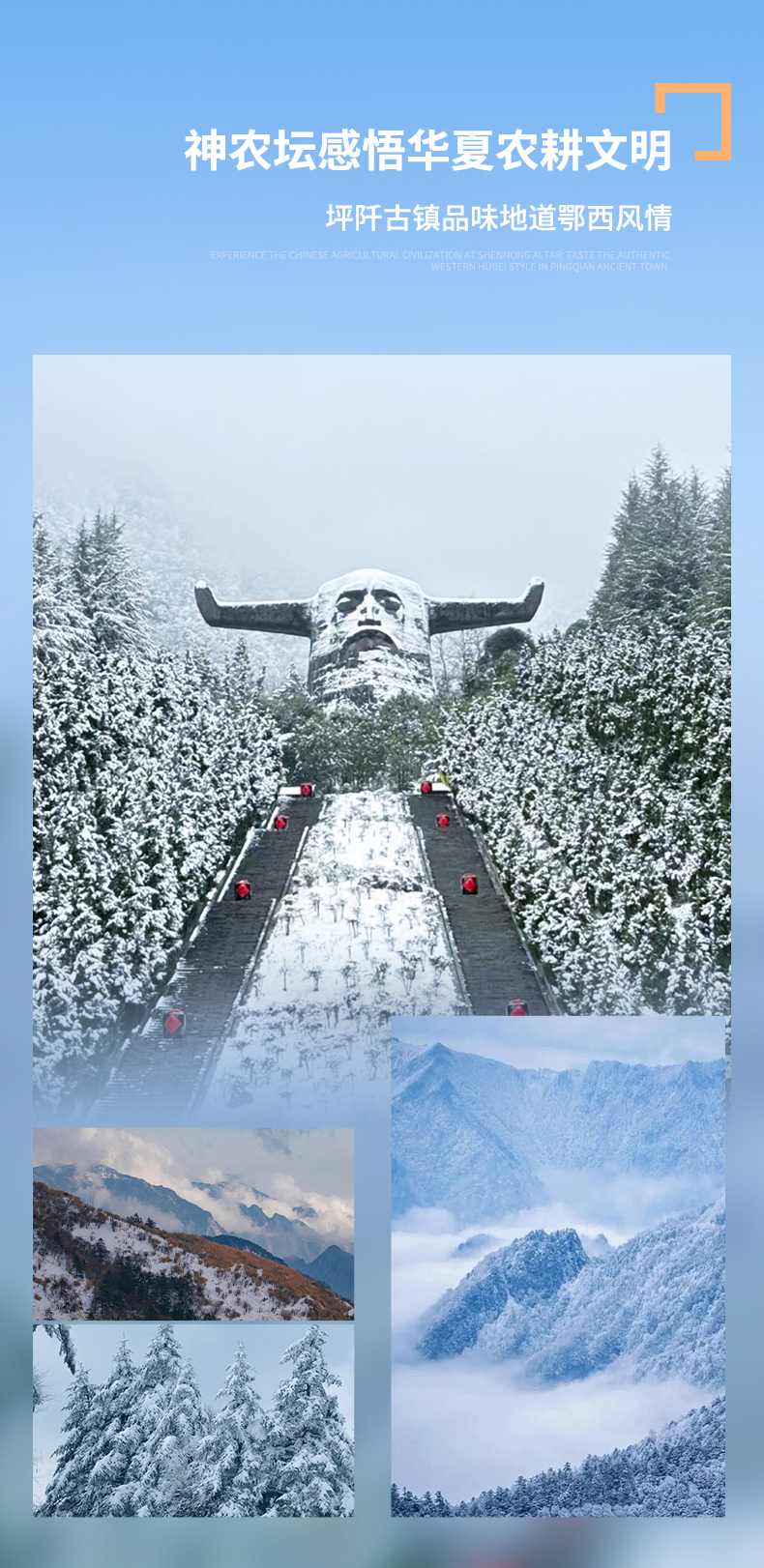 木鱼镇—神农架滑雪场滑雪—金猴岭(冰瀑)—神农谷-神农顶(雪景)—坪阡古镇;