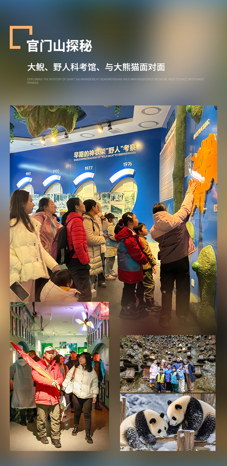 走进官门山,在官门山,还可以参观各种珍稀的动植物标本和科普展览,了解神农架丰富的生态资源和独特的自然文化。进入野人馆,了解神农架野人故事传说,以及了解神农炎帝的故事和功绩。
