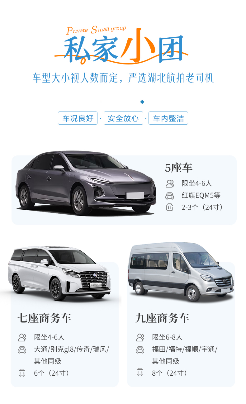 【用车说明】根据参团人数安排车型,保证一人一座。