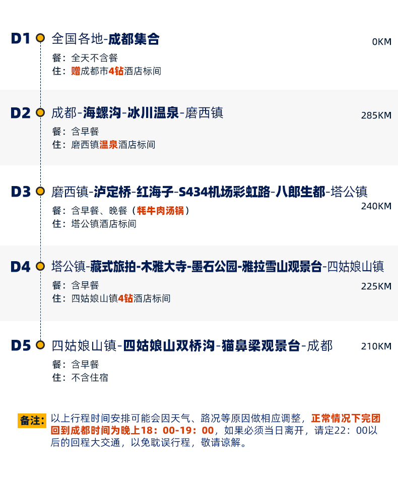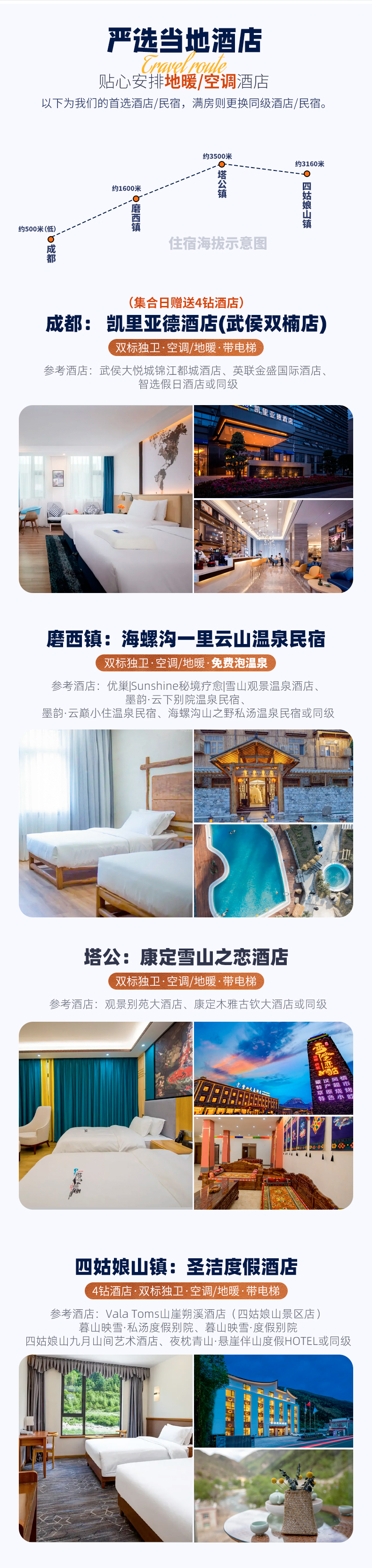4、景交:海螺沟观光车70元/人(必须)、海螺沟索道135元/人(往返、可选)、海螺沟电瓶车30元/人(可选),四姑娘山双桥沟观光车70元/人(必须),墨石公园观光车20元/人(必须),泸定桥保险5元/人(可选),木雅大寺门票16元/人(可选),红海子清洁费30元/人(可选),八郎生都清洁费30元/人(必须);