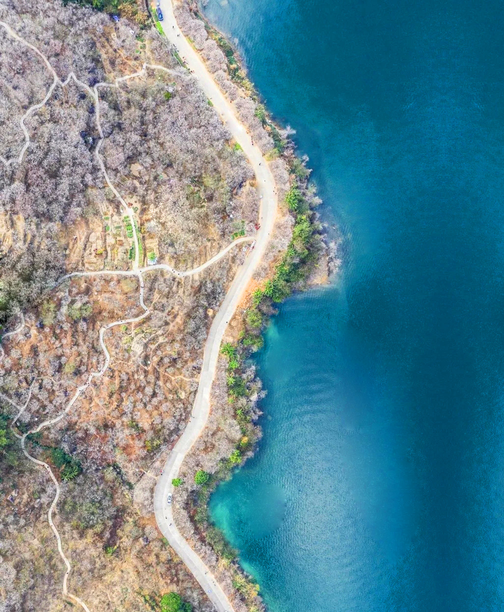 远远地望去,翡翠的湖面,跟梅花相衬
