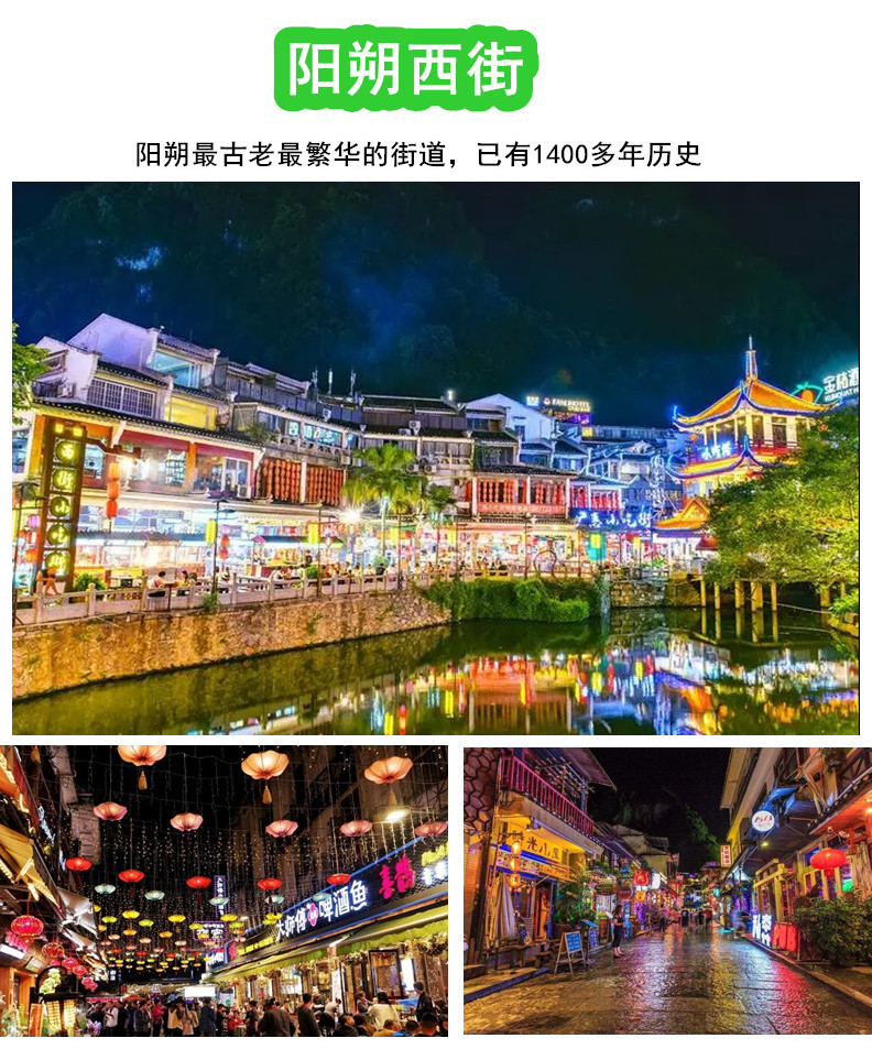 晚上自由活动。夜里,华灯初上,眩目的霓虹灯惊醒了中国洋人街—【阳朔西街】, "不逛洋人街,等于没到阳朔来"。在这里,石板古道与清代砖瓦房遥相辉映,再搭配上现代化的特色小店,浪漫风情尽显,这样的古道适合约上三五知己畅聊,和另一半在异国的西街感受浪漫。