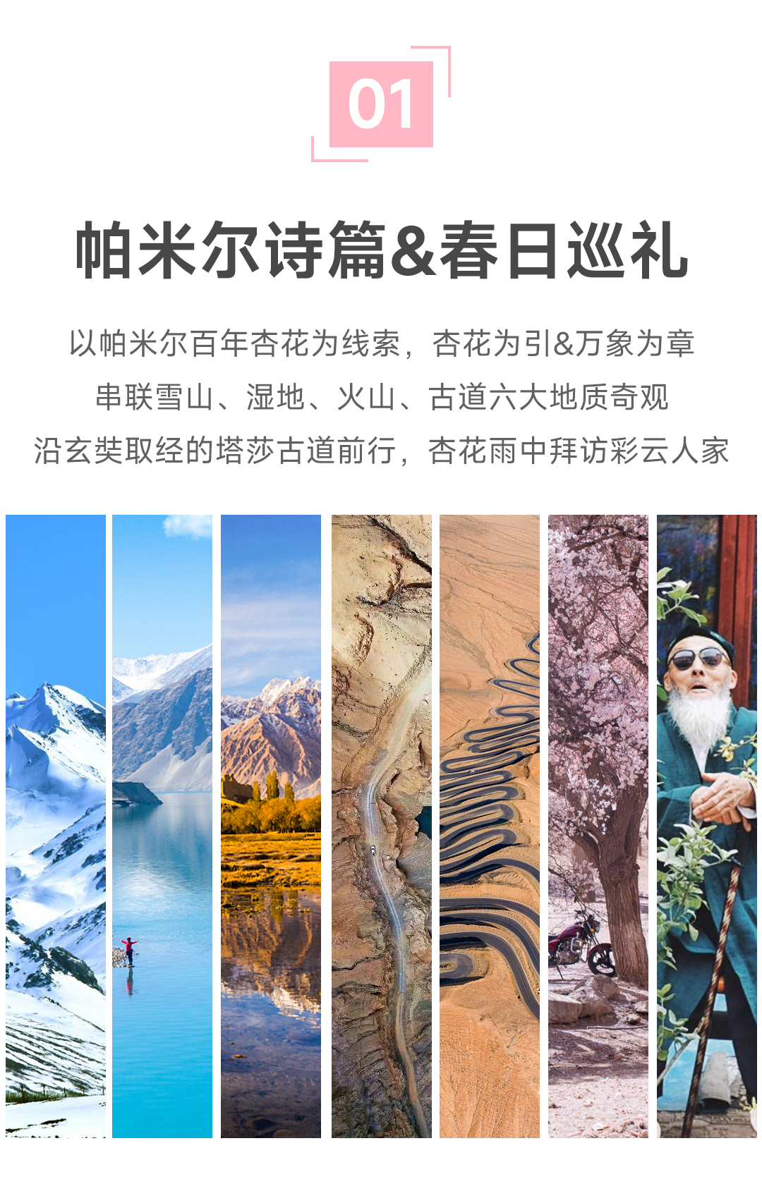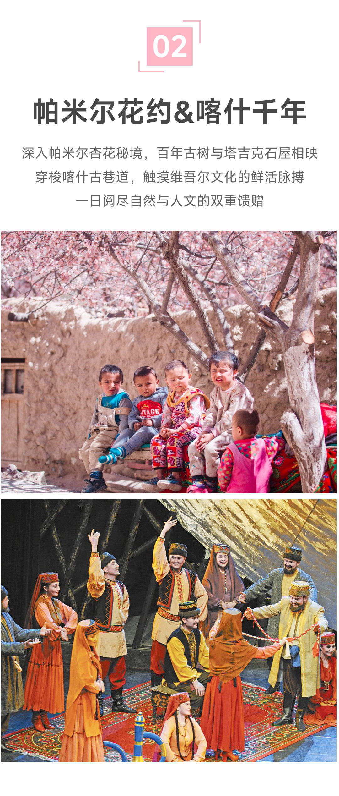 【花期说明】帕米尔高原的杏花,花期一般在3月下旬到4月初期间,不同海拔高度不同地方花开时间都不一样,我司会根据花开情况,灵活调整拍摄行程,zui大限度进行摄影创作;杏花花期较短,受气温及天气变化影响较大,系列团无法确保较佳的花期,请平常心看待,敬请谅解!
