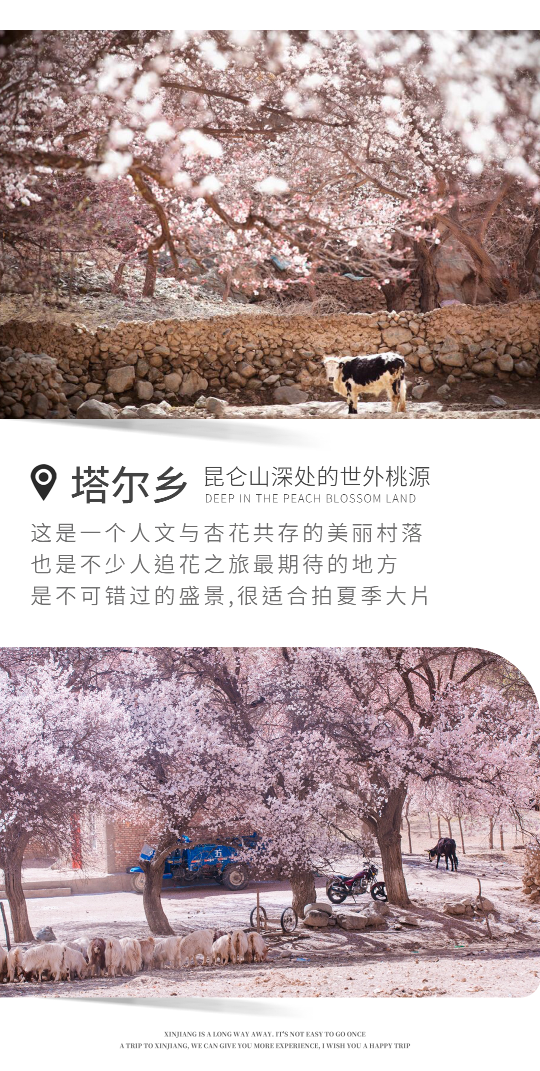 随后前往【库科西鲁克】-杏花吹满头,道路两边,成片的杏花树。后来越往深处,杏花次第绽放,红的,粉的,白的,一树树的花开迷了眼。【塔尔乡幸福五号桥】库克西鲁克塔尔乡杏花村,位于昆仑大峡谷里的“塔莎古道”路旁。“塔莎古道”连接塔什库什尔干县和莎车县,经过阿克陶县塔尔乡、恰尔隆乡,相传为唐玄奘取经东归路,昆仑山巍峨险峻,雪山融水清流激荡,高原杏花姹紫嫣红,塔吉克族风情浓郁,杏花的花期较短,每年从花开到花谢只有18天左右的时间,错过就要等明年咯,晚上入住塔尔乡民宿。