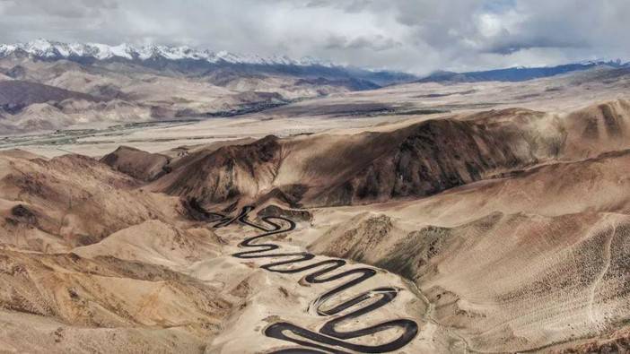 站在山顶远望,整条古道蜿蜒曲折,如同一条巨龙盘卧于山间, 与周围雄浑壮丽的群山、远处连绵的雪山共同构成了一幅雄壮而美丽的画卷。