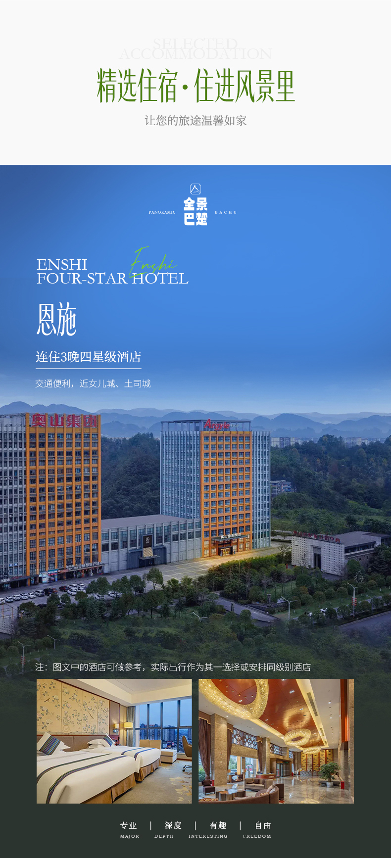 2.【酒店入住】每日12时以后,前台说明“全景恩施+姓名”办理入住,出示证件,押金自理。