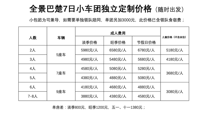 (旺季:4380元/人,儿童3180元/人,房差1200)