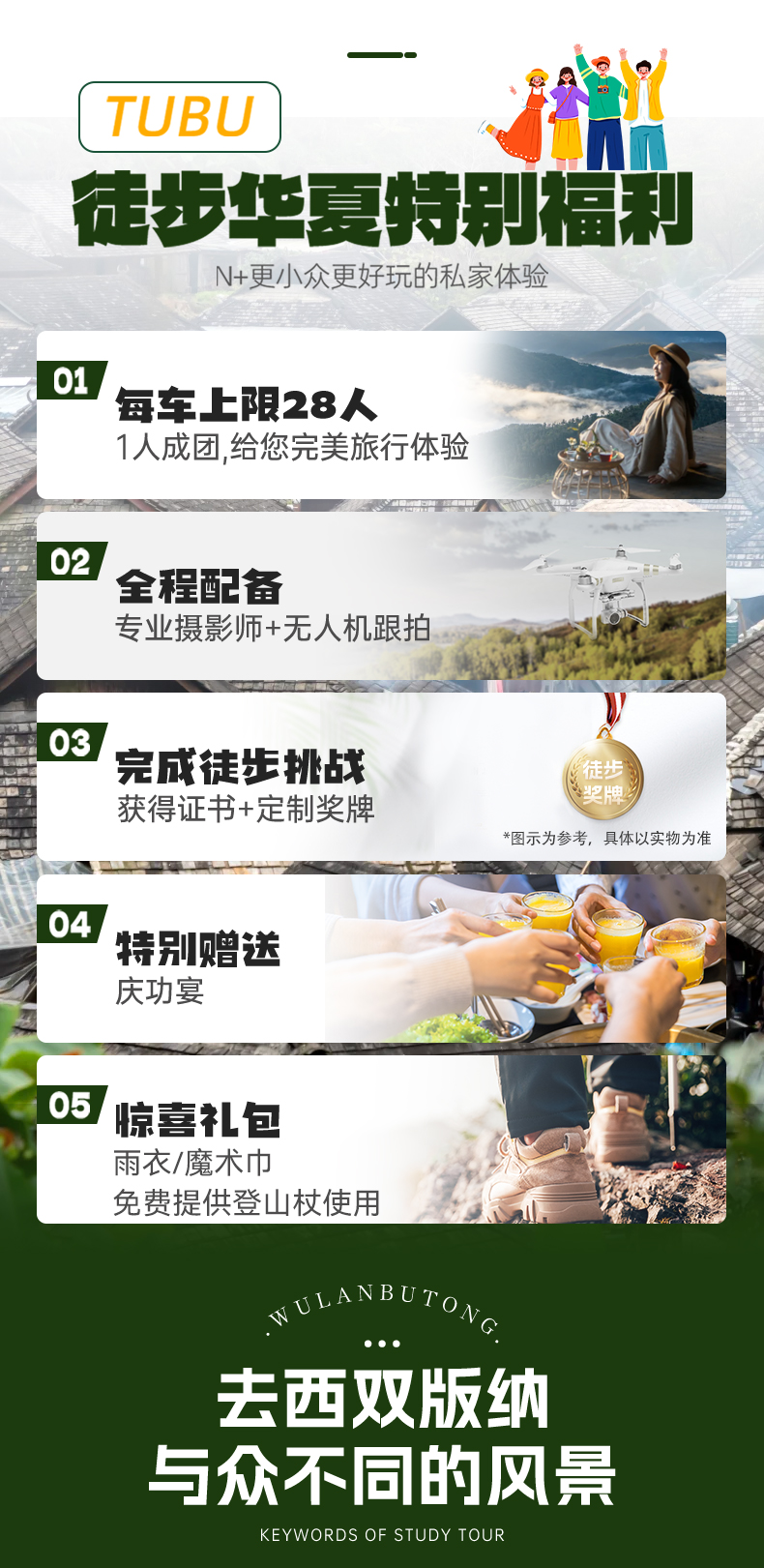 本产品以徒步旅行为主,适用于5-65岁身体健康人士