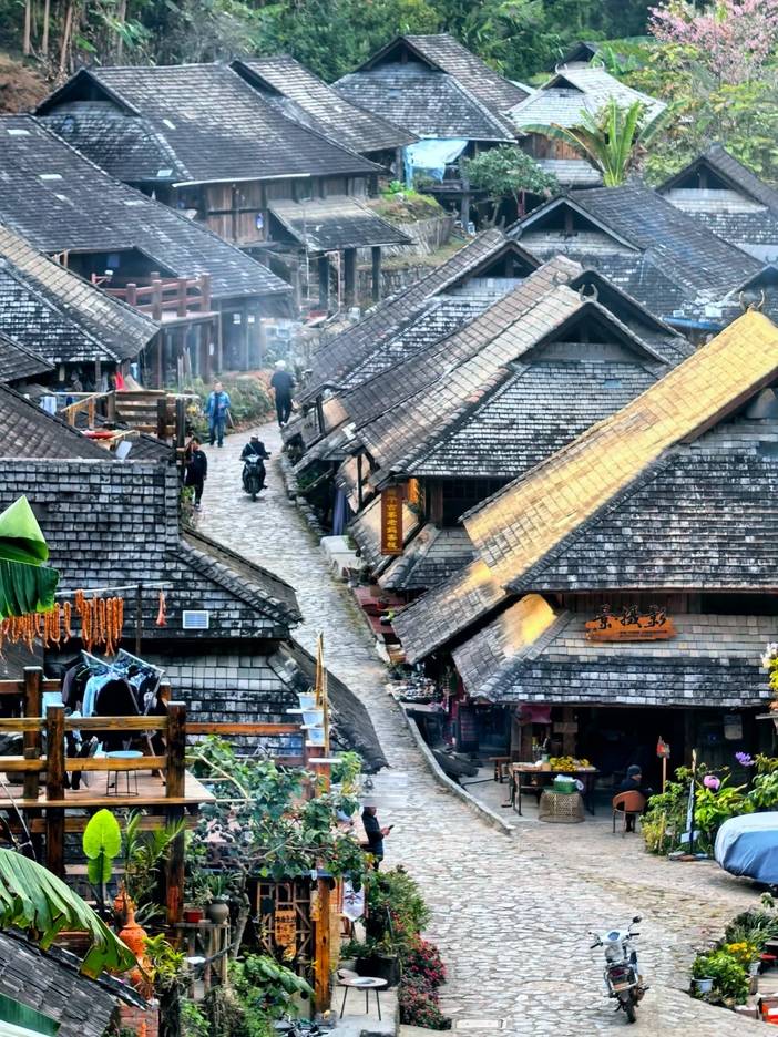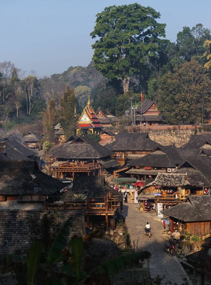 从西双版纳出发,一路向西南而行,穿过起伏的山峦与绵延的热带雨林,便抵达了宁静隐秘的景迈山。首先探访的是深藏于古茶林间的糯干古寨。这里仿佛被时光轻轻搁置,传统干栏式傣家木楼错落有致,四周被千年万亩古茶园温柔环抱。漫步寨中,空气里浸润着茶叶的清香,古朴而安然。