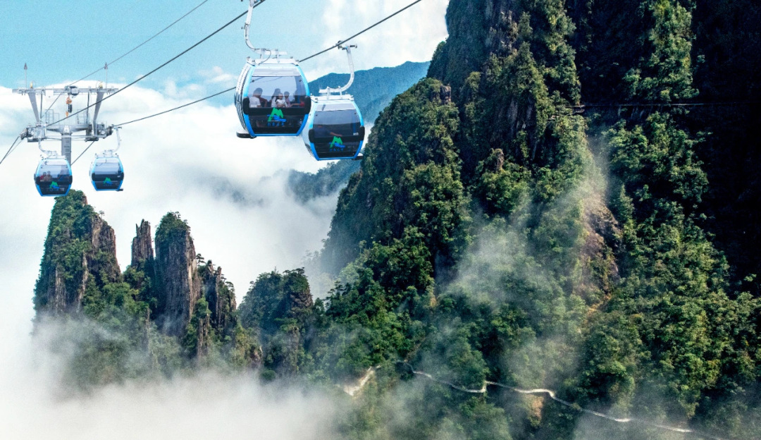 10:00左右到达景区东门口,坐景区接驳车,然后换乘缆车上山(没有其他交通工具,缆车费用自理),南中国最长悬空栈道:乘坐中国目前最长索道单线的观光缆车【五指峰索道】索道全长3.7公里,全国单线最长;每小时客运量达2000人,全国功率最大;全球索道极限高差,达1000米,创造了全国乃至全球索道领域的多项第一,堪称“世界一流、中国第一”五指峰索道。
