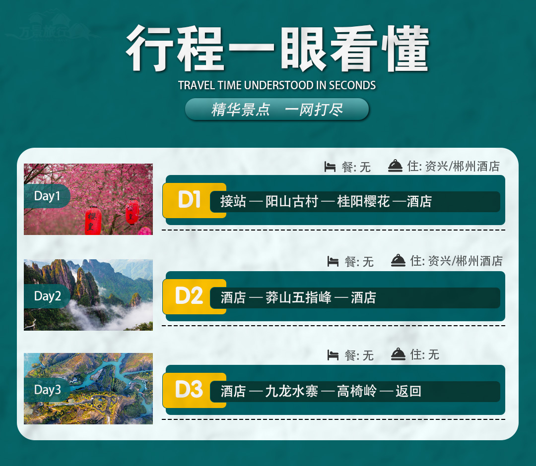 景点:桂阳樱花,莽山五指峰电瓶车,九龙水寨竹筏,高椅岭