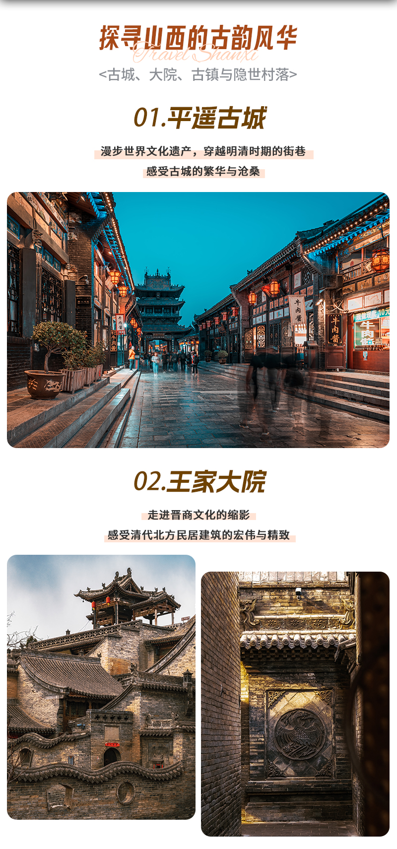 【住宿】太原市酒店标间1晚,平遥古城内特色住宿1晚,碛口古镇酒店标间1晚,宁武县酒店标间1晚,应县酒店标间1晚,大同市酒店标间1晚,五台山景区北门或南门附近标间1晚;共7晚;