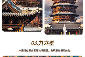 接着,我们便来到了“中国第一影壁”大同【九龙壁】,它色彩之绚丽,气势之宏伟让人眼前一亮。壁身用五彩琉璃拼砌而成,壁上九条龙形态各异,在蓝绿色琉璃瓦的衬托下栩栩如生,仿佛翻腾于碧水蓝天之中。