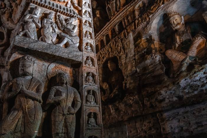 今天,我们将拜访中国四大石窟之一的【云冈石窟】。这里堪称色彩艺术的集大成者,更是浮雕艺术的巅峰。无论是阳光下神圣的露天大佛,还是令人眼光缭乱的莲花藻井,都深藏历史的厚重。抬头仰望,这里的一凿一石是古人造就的不朽文明,时间带不走它的悲悯,它却能轻易把你带回千百年前的北魏。
