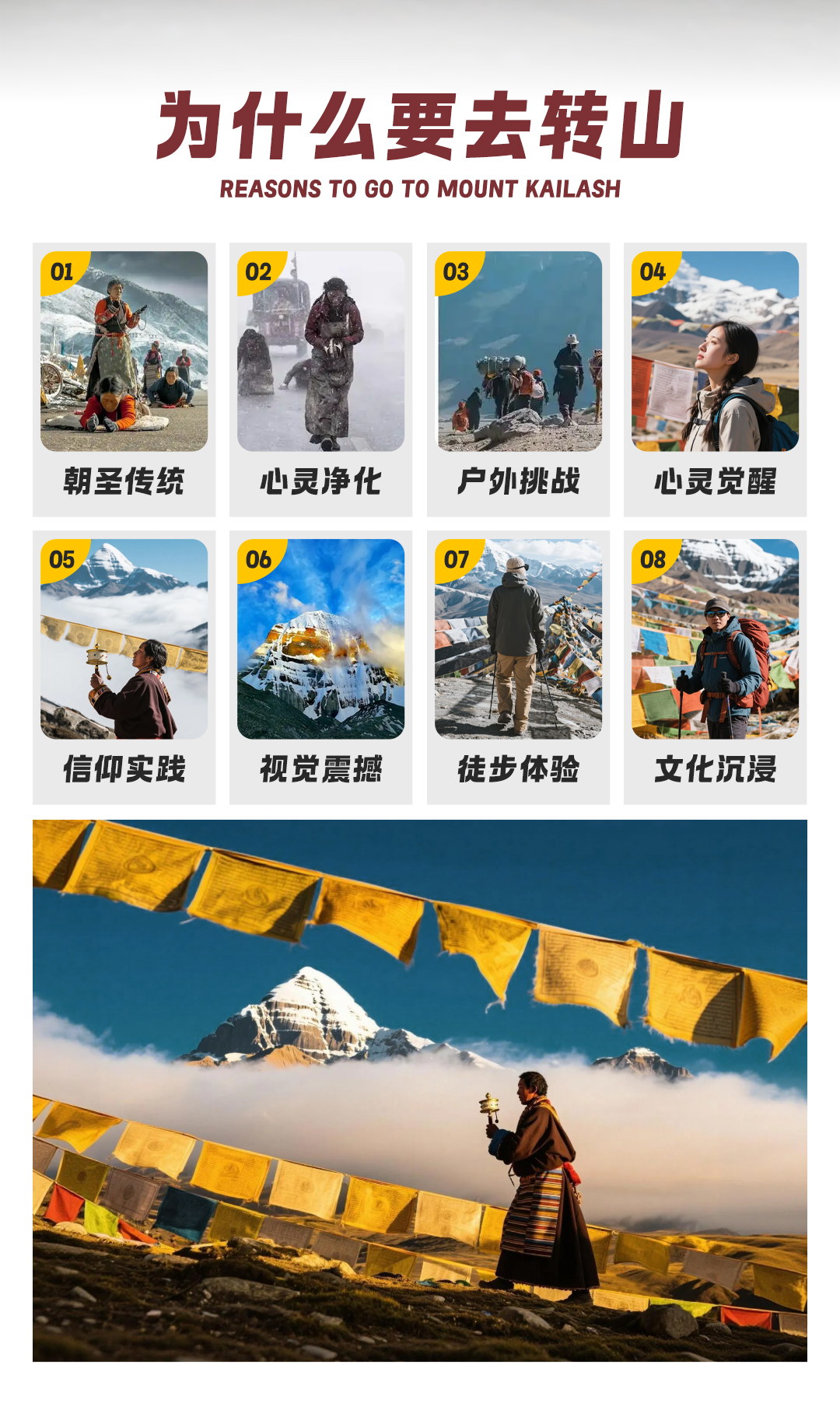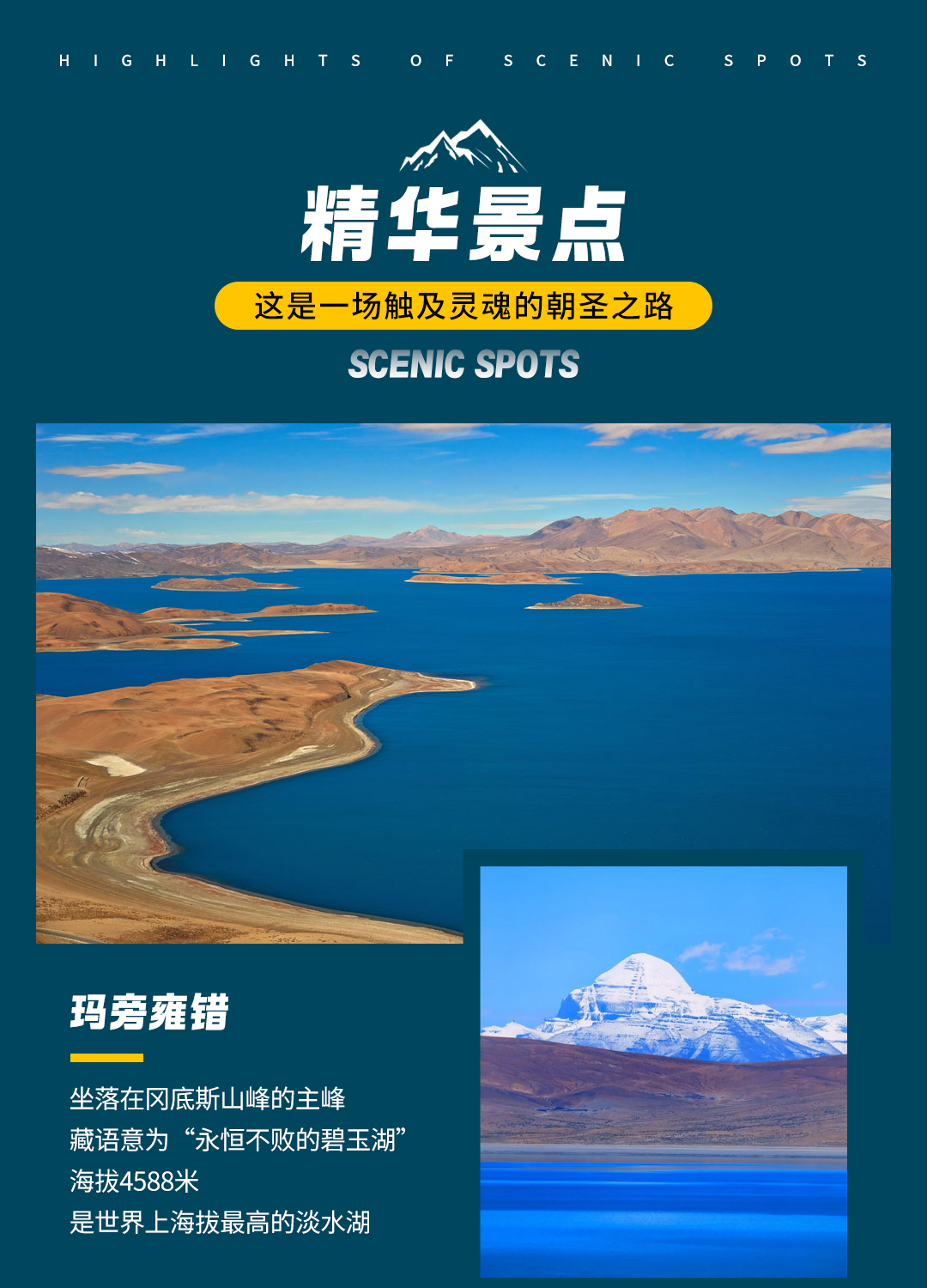 随后前往古加措,古加措是玛旁雍措旁的小湖,周边景色富有传奇色彩。玛旁雍措是西藏三大圣湖 之一,有“世界江河之母”的称誉,湖水清澈透明,波光粼粼。在玛旁雍措,您可以感受到圣湖 的神圣与庄严,还能欣赏到绝美的湖光山色。最后抵达塔尔钦,塔尔钦是转山的起点,在这里可以 为明天的转山行程做好准备。