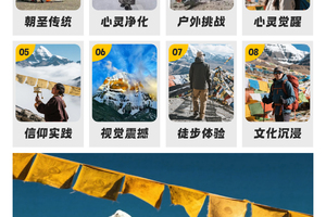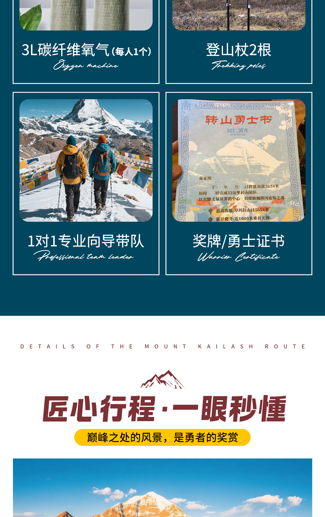 4.领队:特价团两期一对一转山向导,可背包、背氧气,服务时间为两天,背包重量10KG以内。负责带领转山道路、保证客人安全、处理突发情况,可友情转山拍摄,后面正常团期一对一转山向导可提前预定,价格按照市场行情波动。除转山其余四天行程配备司兼导,负责简单介绍+观光行程的航拍