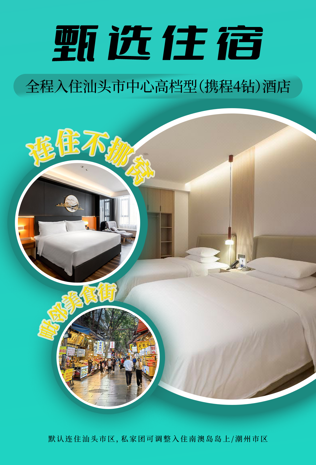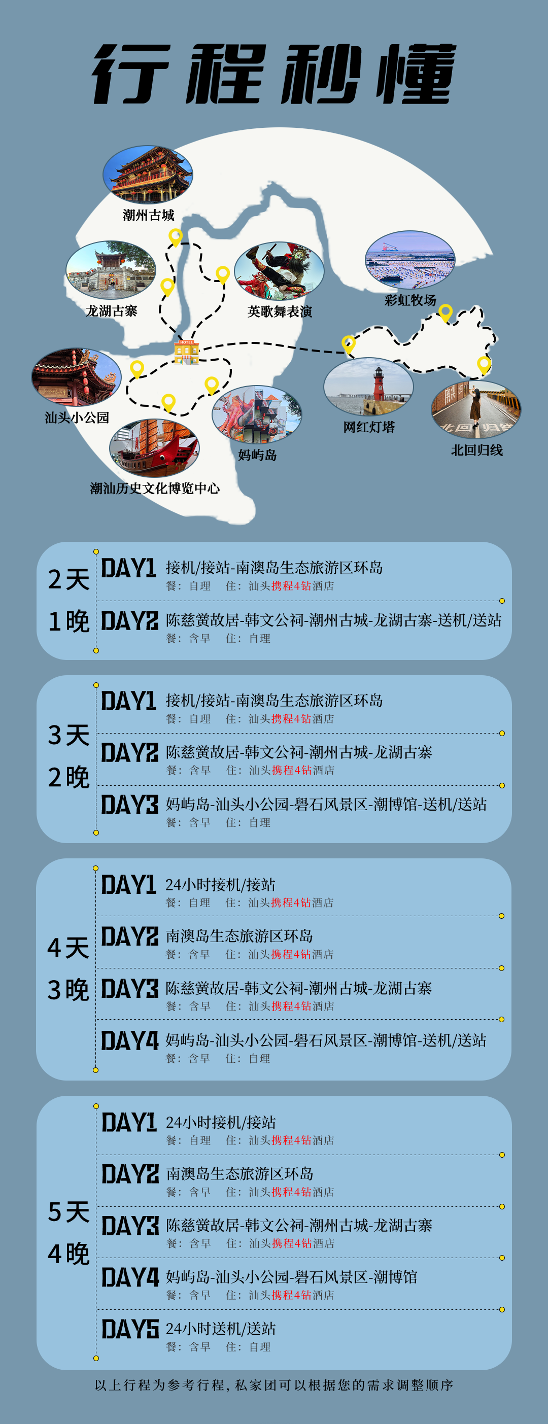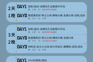 3. 住宿:全程汕头市区高档型酒店,参考:桔莱尔酒店、凯亚伦酒店、铂晶大酒店或同级。每间房默认2人,无三人间无加床,如出行人数为奇数请补房差。一大一小出行请按2份成人价报名【如需升级豪华型酒店、入住南澳岛岛上酒店、调整酒店位置等,详询客服】