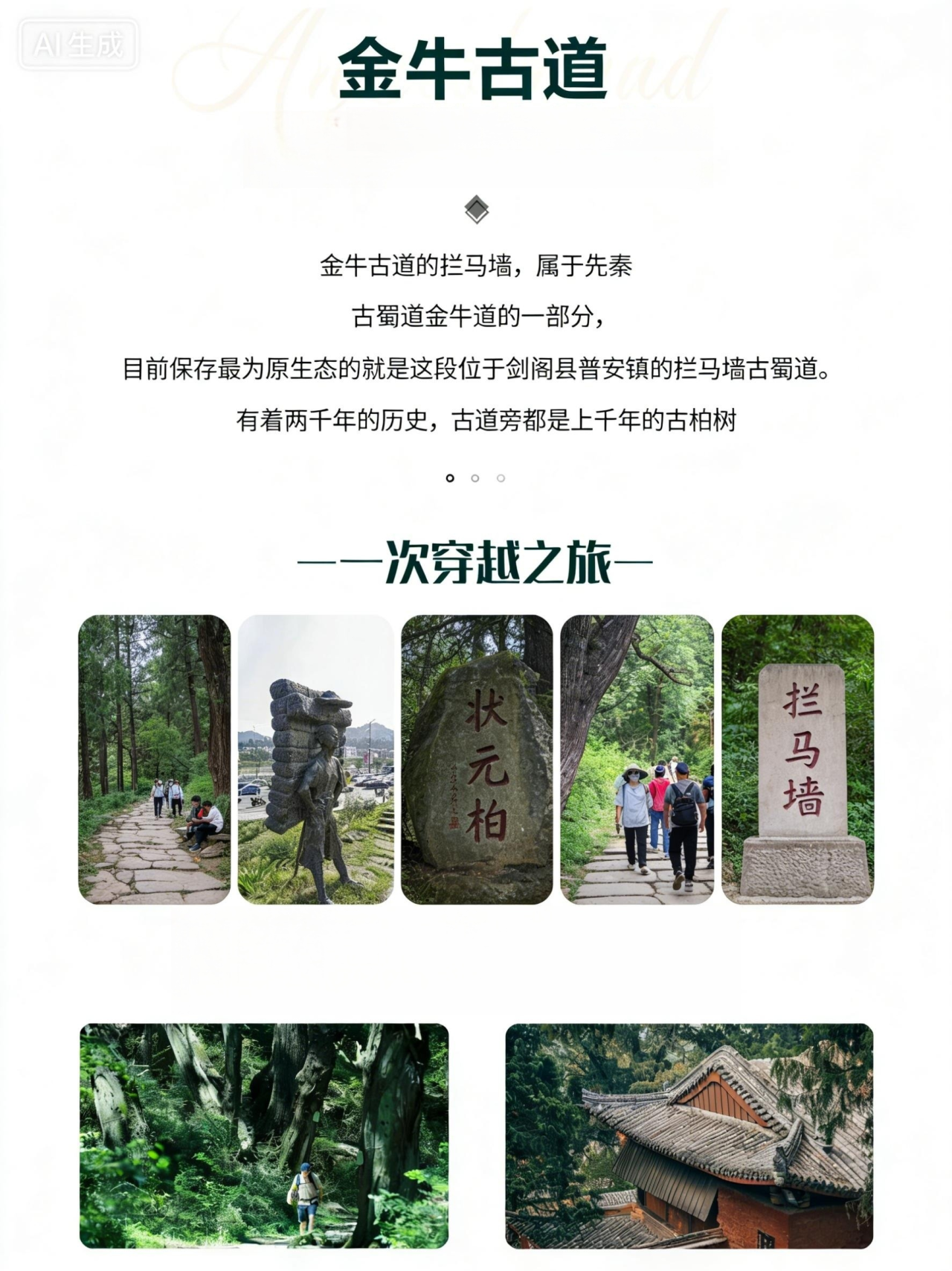 早餐后前往梓潼,这里不仅有金牛古道历史文化遗迹,还是文昌发祥地。随后前往觉苑寺以“明代佛传壁画”闻名,壁画内容完整、色彩鲜艳,生动展现了释迦牟尼一生的事迹,被誉为“蜀中敦煌”。重点参观大雄宝殿内的壁画,注意殿内禁止拍照,需遵守景区规定。游览过程中可聆听讲解,了解壁画的创作背景、艺术价值及保存历程。后前往拦马墙,是古蜀道金牛道上的重要路段,因古代为防止马匹跌落而在路边设置石墙得名。这里保存着完整的古驿道、古柏、古桥、古碑,空气清新,充满原始古朴的气息。游览时沿古驿道徒步,欣赏千年古柏群,感受“一夫当关,万夫莫开”的蜀道险峻,全程徒步约1.5小时,难度较低,适合所有人群。