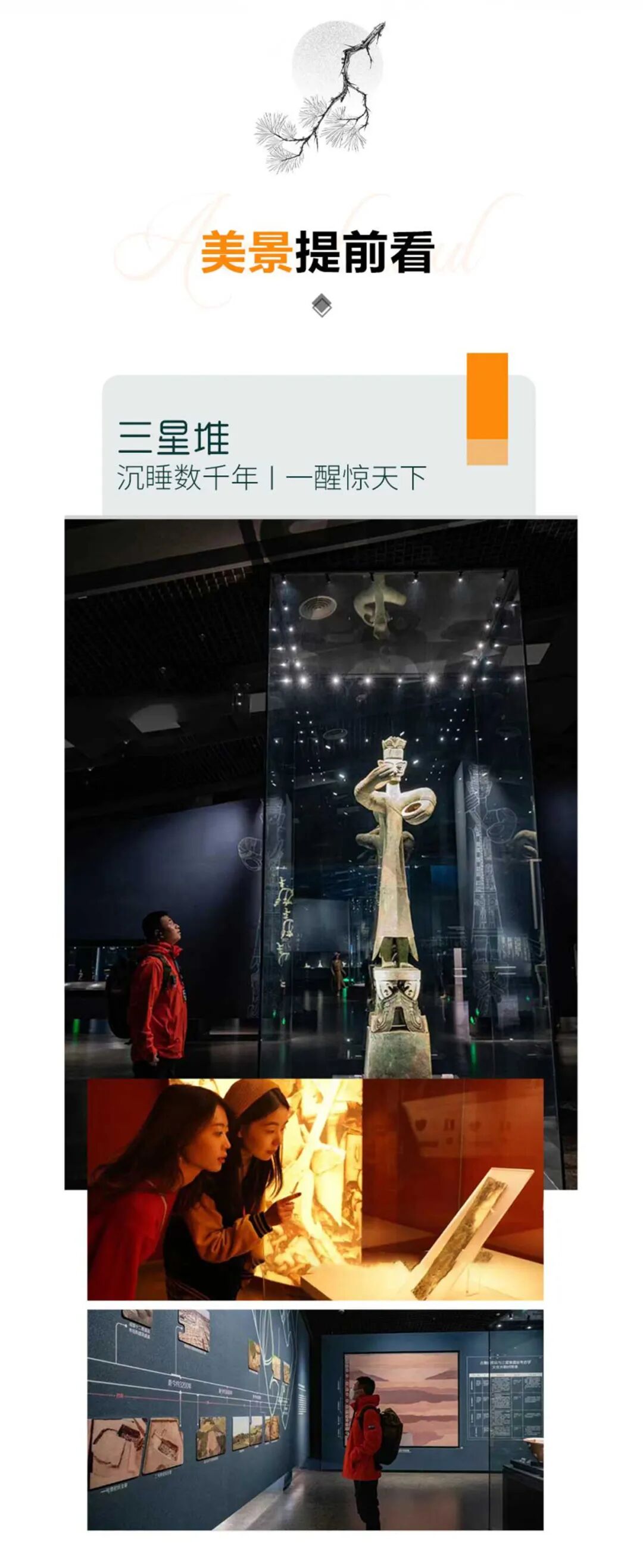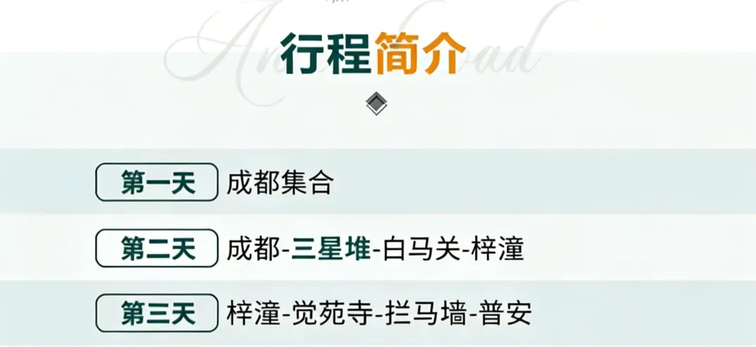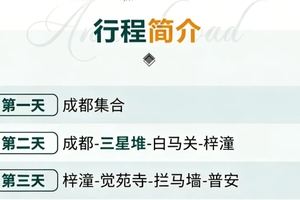 早晨从成都出发,前往广汉【三星堆】,这是一个充满神秘色彩的古蜀文明遗址,被誉为“20世纪人类最伟大的考古发现之一”,距今已有5000多年的历史,是当时古蜀国的中心,孕育出了独具一格的古蜀文明。目前遗址的考古工作仍在进行,让我们一起期待更多的考古发现吧! 午餐后,走进德阳【白马关】。这是秦入蜀的最后一道关隘,是整个西川、成都平原的屏障,有“南临益州开千里沃野,北望秦岭锁八百连云,东观潼川层峦起伏,西眺岷山银甲皑皑”之势。走进城门,正中是金牛道,右手边就是庞统祠墓。庞统祠和庞统墓,坐落在白马雄关之巅,掩映在森森翠柏之中。它是四川最早、保存最为完整的一处三国蜀汉遗迹,不仅是三国蜀汉政权兴亡的见证地,而且也是全国唯一纪念三国时期政治家、军事家庞统的专祠。晚上入住梓潼县城。