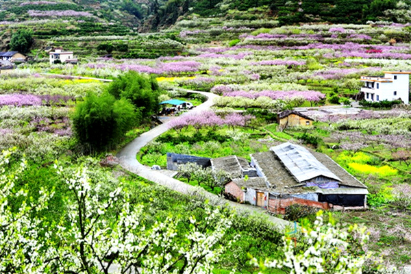 桃花,李花,梨花竞相开放,红的,白的,黄的(其中点缀的油菜花),绿的,色彩绚丽,