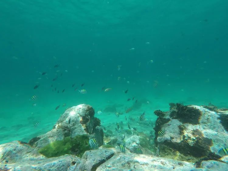 这里受到的污染比较少,海洋生物多,有海胆、海星、珊瑚礁、热带鱼类等↓海底实拍图