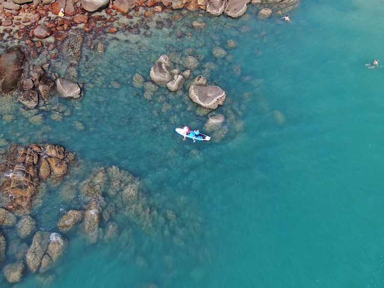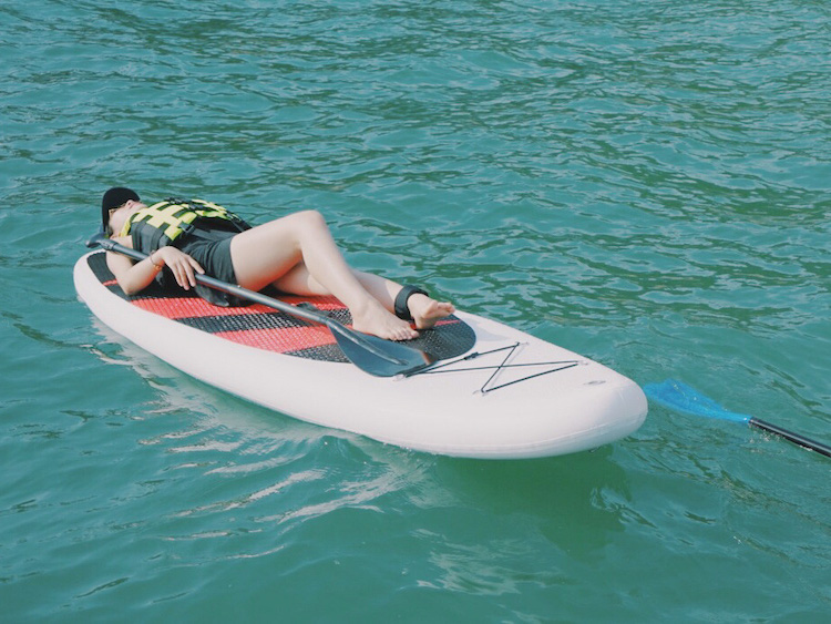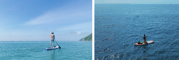 2人一条桨板,自由自在,遵循自己的速度,慢慢的在海上划行~