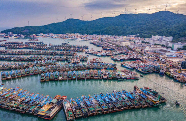 一箱箱带鱼、剥皮鱼、马鲛鱼、海蟹、对虾等丰富海产每天从船上吊装上岸,