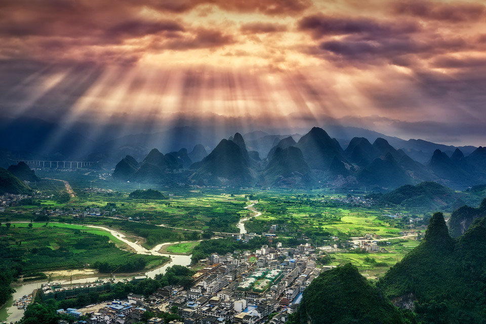 漓江上一颗璀璨的明珠,位于阳朔县东北部。20元人民币的背景地就是在兴坪。具有1700多年历史,各类砖瓦结构的古建筑大部分保存完好,古街的东南侧狮子旦为熙平县城遗址,城墙轮廓尚清,随处可见古砖瓦陶瓷残片,只是原来车马来往人看人的繁华县城,呈现出一派青山幽幽、村舍几座的肃静氛围。