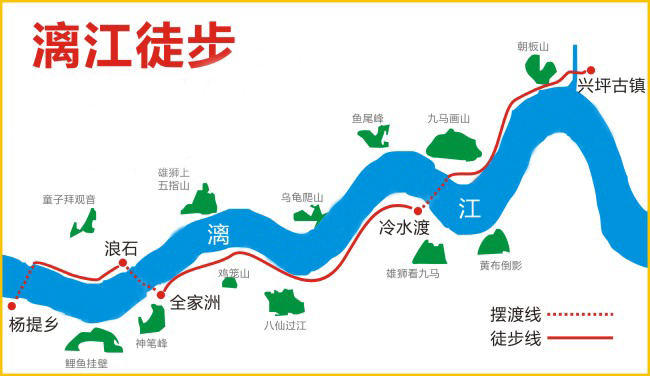 全程18公里,徒步时间约6小时,沿途经过3个横水渡口,6个自然村。沿江景色美不胜收,有浪石风光、下龙风光、甲天下风光、九马画山、黄布倒影、二十元人民币背景地。
