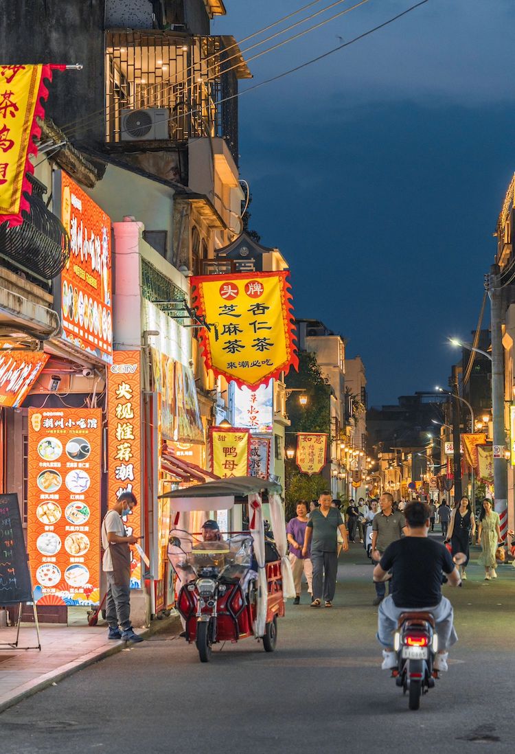白天的时候可以去与牌坊街相间的多个古巷里面走街串巷扫街,这里有潮州文化最为纯粹的缩影。晚上来,灯光下的牌坊街更绚丽。